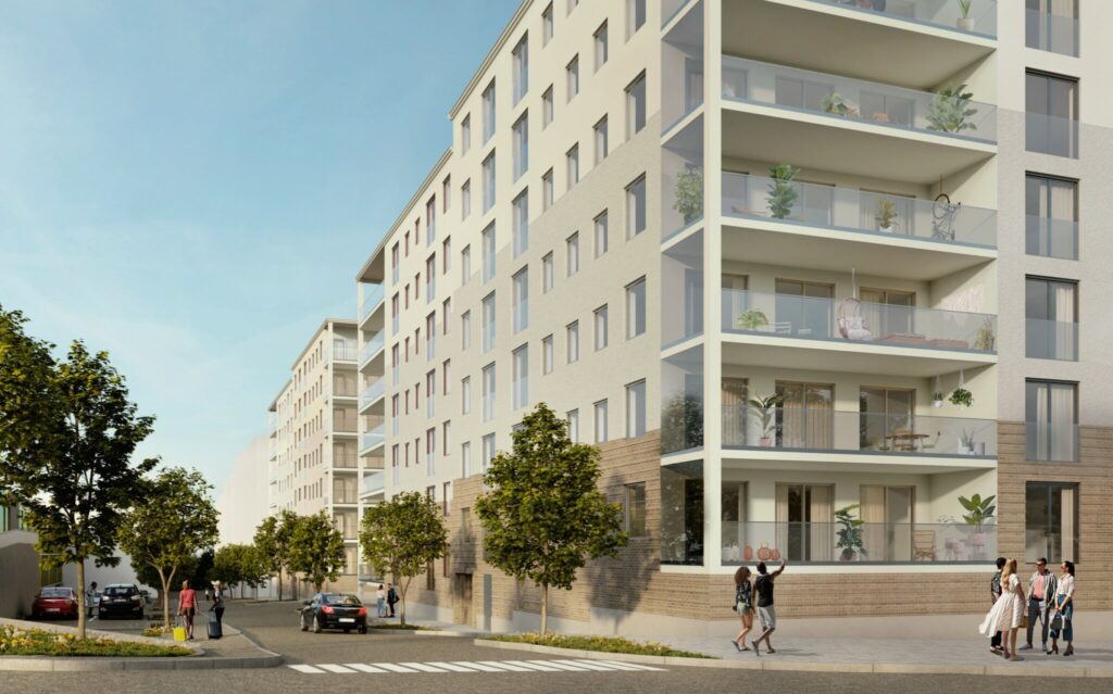 326 hyreslägenheter och fem lokaler kring två innergårdar. Bygglovs- och systemhandlingsprojektering för upphandling av totalentreprenad.